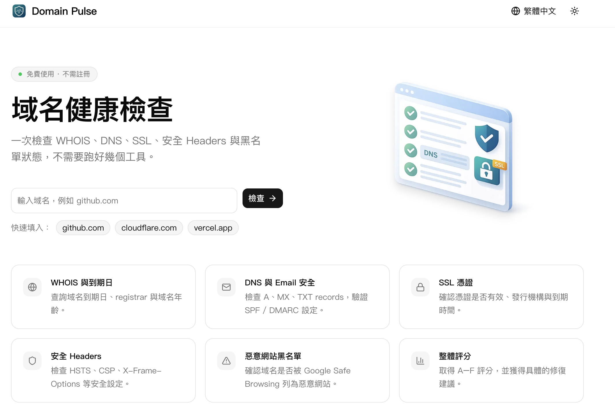 Domain Pulse 是一個用來快速檢查網域健康狀態的工具。使用者只要輸入 domain,就能一次查看 WHOIS、DNS、SSL、安全 Headers、Email 安全設定、IP 位置與黑名單狀態,並獲得整體評分與修復建議。